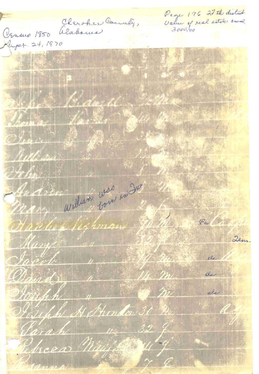 Jacob Neyman was born in 1780 in Pennsylvania. Jacob was listed in the Monroe County, Tennessee census of 1830. He came to Benton County, Alabama, in 1831. This part of Benton County is now Cherokee County. His wife (Mary Pugh) may have been a second wife, and there may have been more children. Mary Pugh was born in Tennessee. He settled on Terrapin Creek, and the first records show the spelling as Nighman. He was a cooper, and by the 1860 census, the spelling was Neyman. In the book Settlement of Cherokee County, it uses the spelling Nighman in one place and Neyman in another when talking about Jacob Nighman of Pennsylvania.