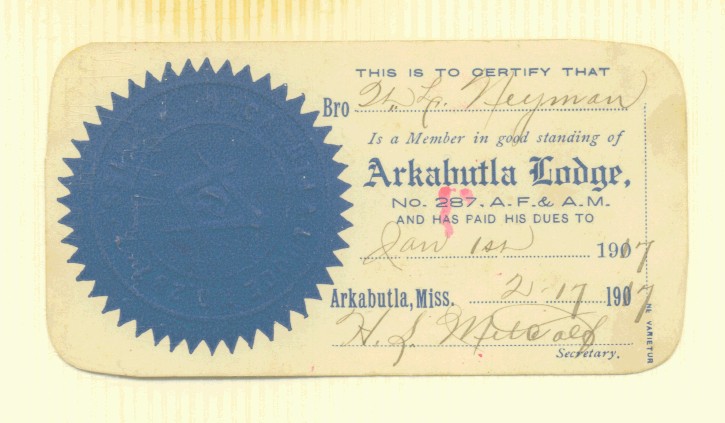 Arkabutla Lodge Membership Card, 1917