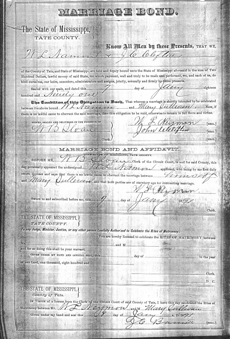 Willie Lawson Neyman was born in Town Creek, Lawrence County, Alabama. He is the son of David C. Neyman and Elmira Hawkins. He married his first wife, Mary Sullivan, in Tate County, MS (8 Jan 1891), and had one daughter by her. One tale that was told is that two brothers got into a fight in Town Creek, AL with some Indians, and Willie killed one of them (cannot be verified). Soon after, he moved to Arkabutla, (Tate County) Mississippi. His brother Dallas Hawkins came to Mississippi with him. They came from Alabama on horseback, sleeping in barns or camping out on the way. According to Dallas Hawkins, they were on the way to Arkansas, and stopped in Arkabutla and raised a crop. They liked it so well, that they stayed there. Both brothers settled near Arkabutla. Willie married Elnora Adeline Haley, and both Jesse and Maude were born in Arkabutla.